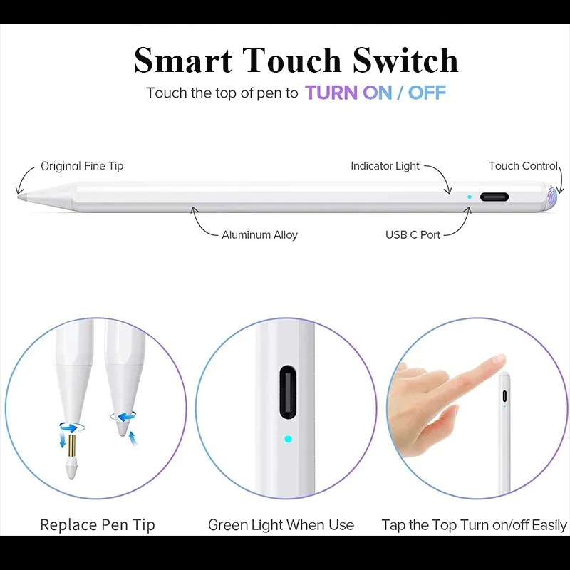 اتصال از طریق بلوتوث ، دارای ویژگی Palm Rejection ، نوک مشترک با نوک قلم اورجینال ، نوک قابل تعویض و حساس به فشار و زاویه Tilt ، دارای آهنربای داخلی اتصال به آی پد ، دارای کابل شارژ USB-Type C ، نمایش باقی مانده باتری در آی پد